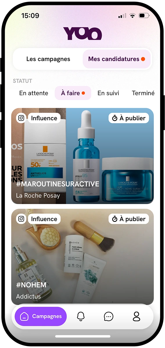 Les plateformes comme YOO centralisent des campagnes actives. Il te suffit de créer un profil et de postuler selon tes centres d’intérêt. Plus besoin d’attendre qu’une marque te contacte.