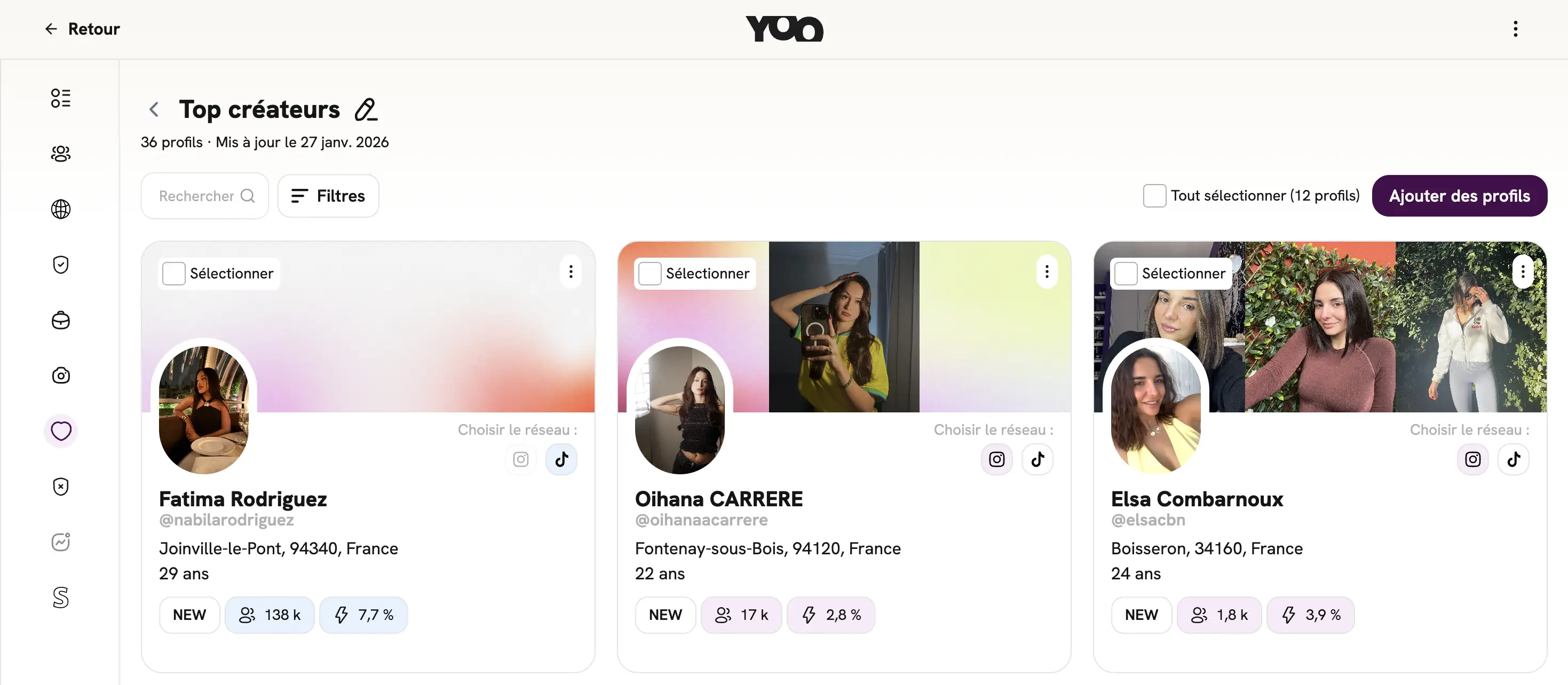 C’est un outil stratégique qui vous permet d'avoir vos listes de créateurs prêtes par thématiques ou par affinités, vous faisant gagner un temps précieux. La gestion est totalement flexible : vous pouvez ajouter ou enlever des profils au fur et à mesure pour garder une sélection toujours alignée avec vos objectifs.